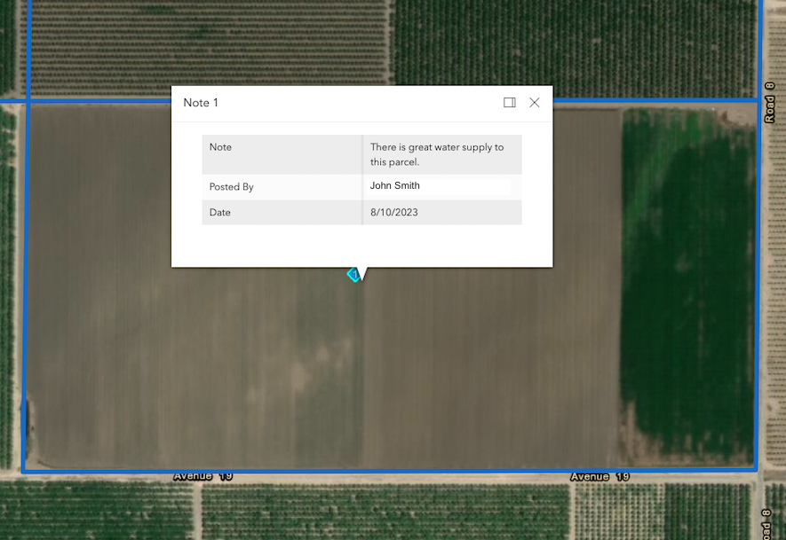 Utilizing notes is an excellent method for associating extra details to parcel groups and exchanging information with your colleagues. These notes can also be spatially tagged on the map, enabling you to precisely pinpoint information to a specific location.