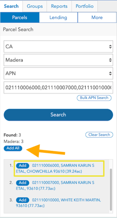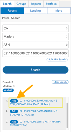 - Add parcels individually from the search results by selecting "Add" beside of the parcel information in the search results