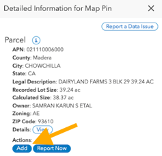 - Click on a parcel on the map (the righthand side bar will appear). Select "Add" from the Actions section in the right hand sidebar