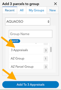 - Once the "Add" or "Add All" buttons are selected, a window will pop up with the option to add the parcels to an existing group, or create a new group.