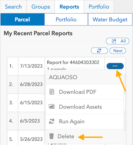 - Navigate to the Reports tab and select the subtab for the type of report (Parcel, Portfolio, Water Budget) you want to delete