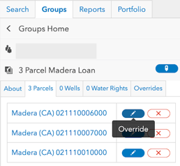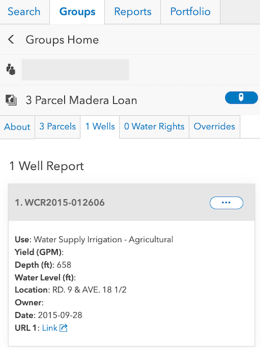 - The Wells and Water Rights sub-tabs display a list of wells and water rights associated with the parcel group. Wells and Water Rights must be manually added to a parcel group.