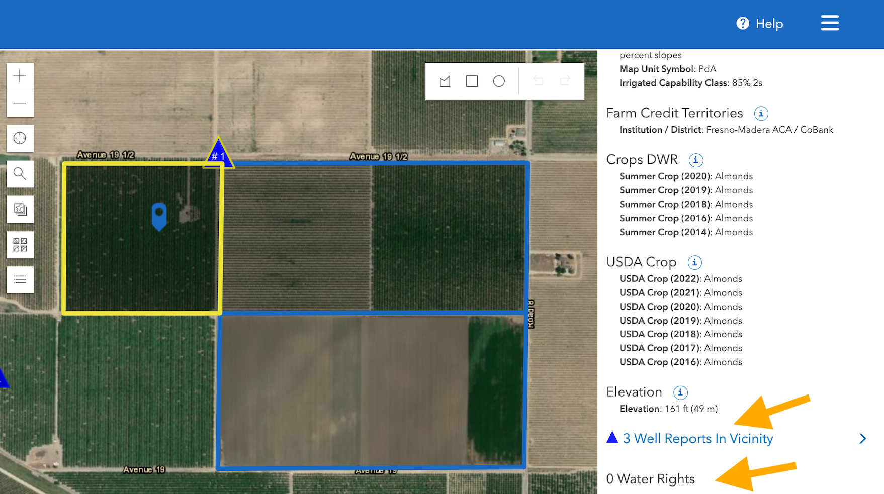 - To add Wells or Water Rights to a parcel group, click within a parcel in your parcel group on the map. The right hand sidebar will appear. Scroll within the right hand sidebar to the Wells and/or Water Rights information. Click on the Wells or Water Rights text to view a list of all Wells or Water Rights in the area. It can also be helpful to turn on the Wells and/or Water Rights map layers to view their location together with your parcel.
