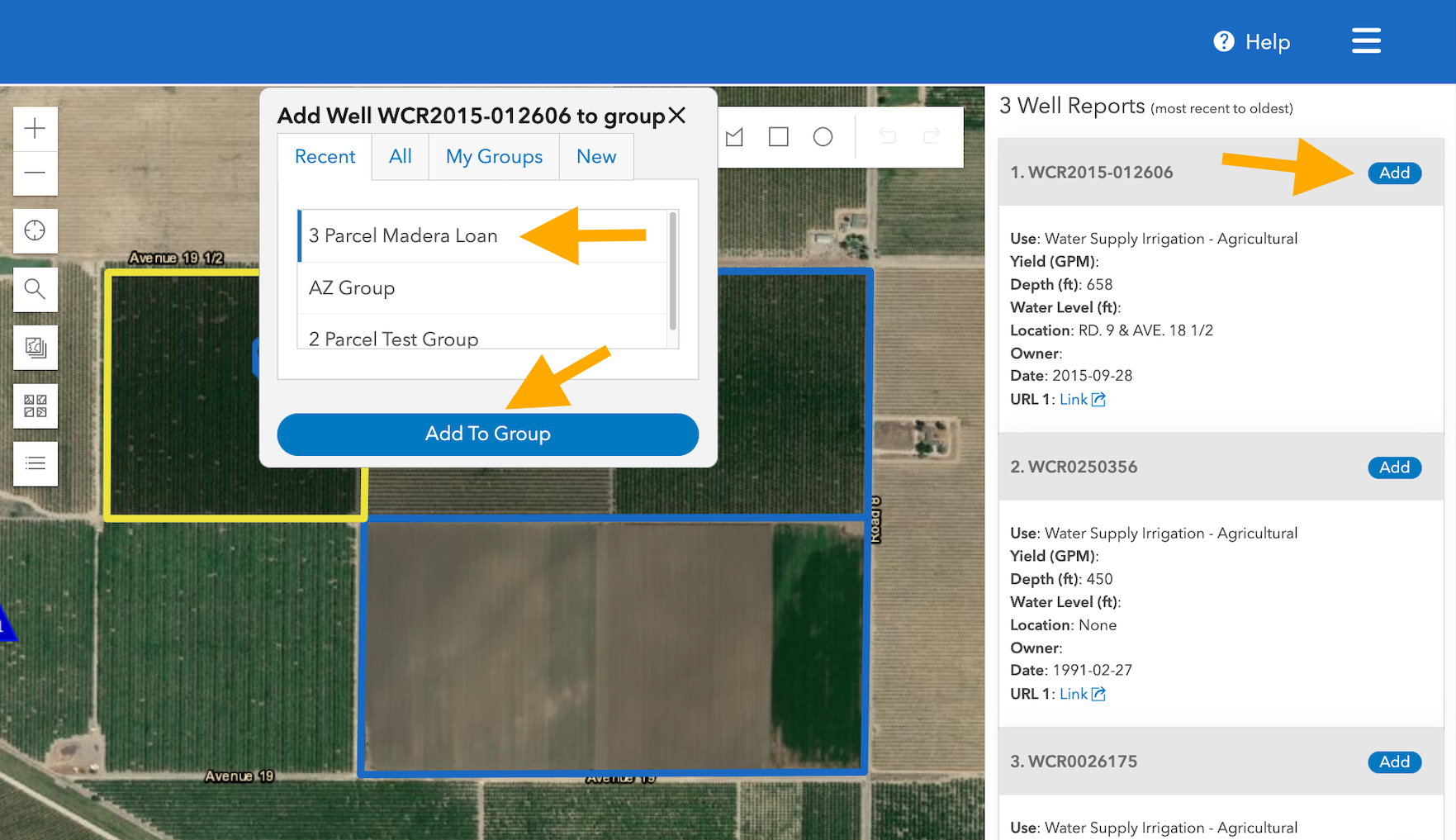 - Select the "Add" button on the Well or Water Right you want to add to your parcel group. A new window will open. Click the parcel group you want to add it to then select "Add To Group".