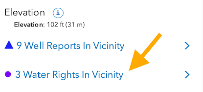 - Scroll to the Water Rights information and click on the "Water Rights In Vicinity" text to view all nearby water rights.