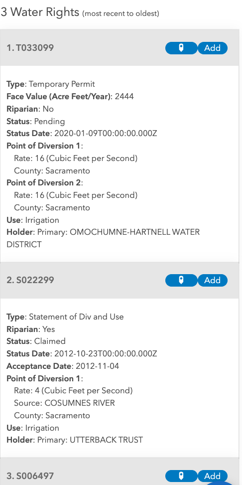 - Here you can view Water Rights details and add them to your Parcel Group