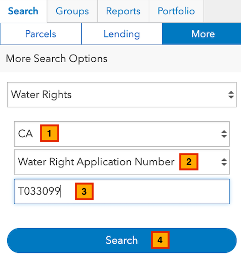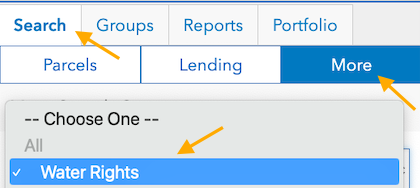 - Click on the Search tab on the left hand sidebar, select the "More" sub-tab, and then select Water Rights