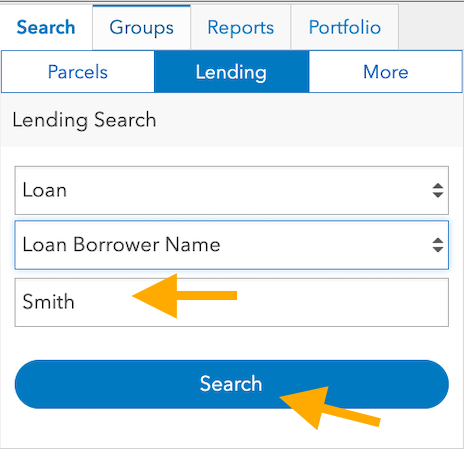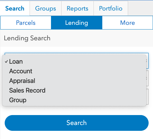 - Once the lending object and type are selected, enter the search criteria and select Search: