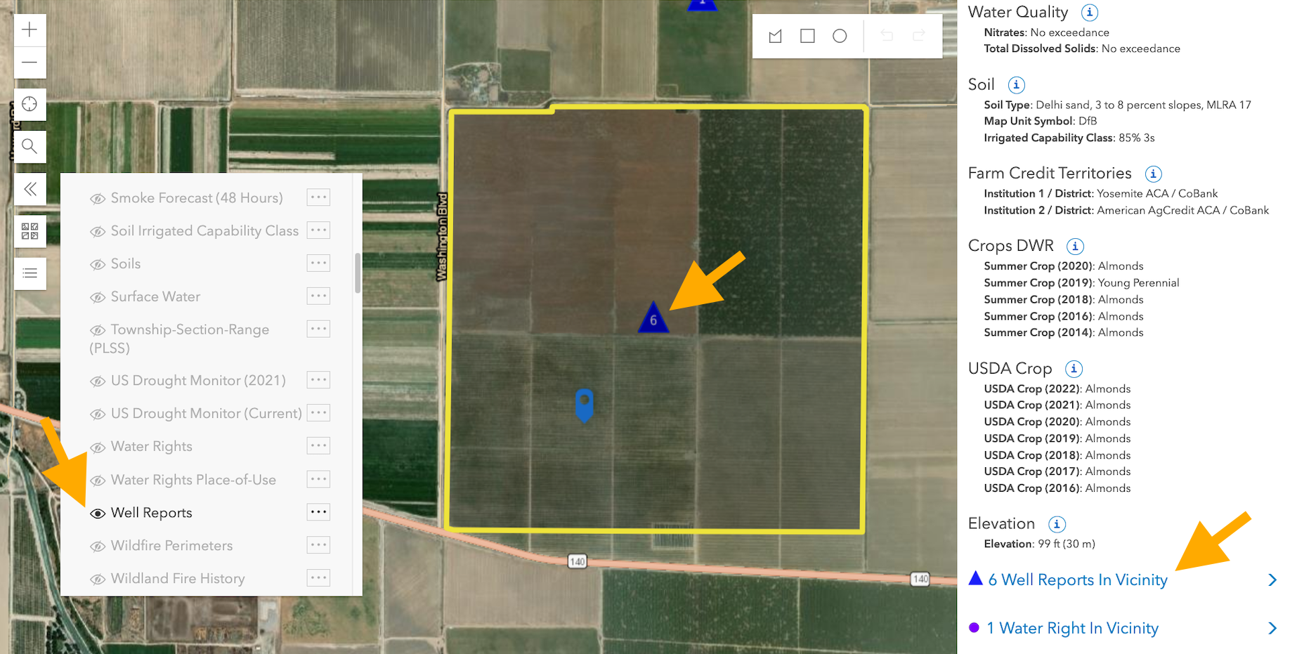 - Click within a parcel on the map to open the right hand sidebar and scroll to the Well Reports In Vicinity link. On the map, you will be able see locations of well reports.