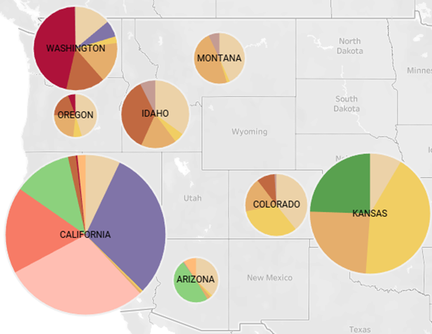 The below map shows the proportion of top crops for the eight states currently served by Agcor. The size of the pie charts on the map are based on the aggregate value in production, measured in US dollars.