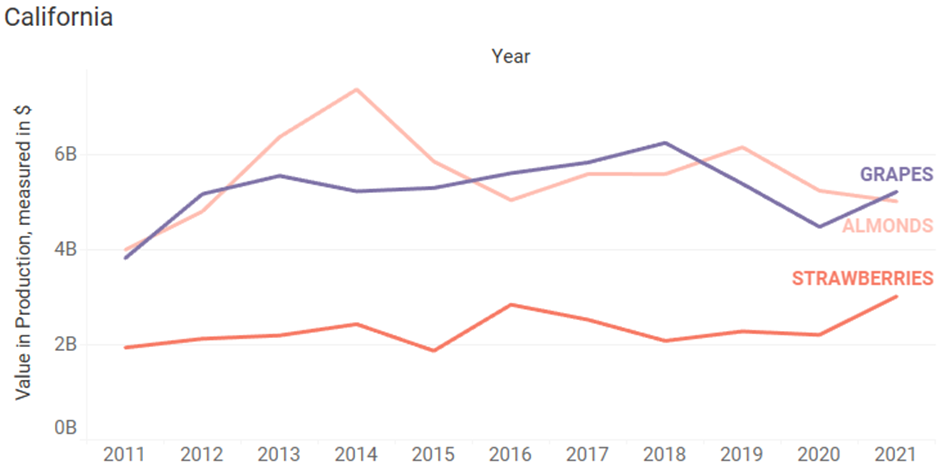 - Grapes and almonds in California have experienced a similar range in value for crop production over the past 10 years, though grapes were somewhat more steady where almonds exhibited more volatility.