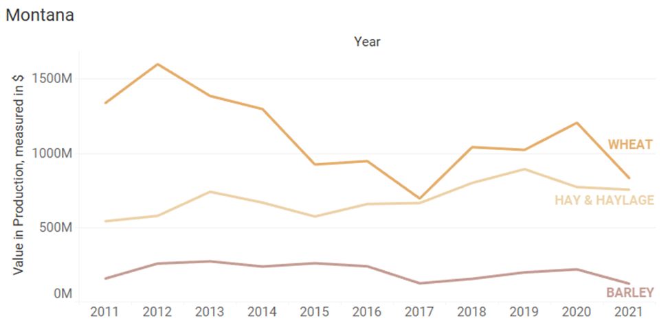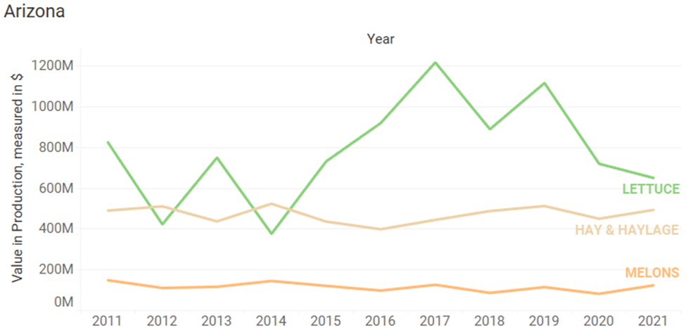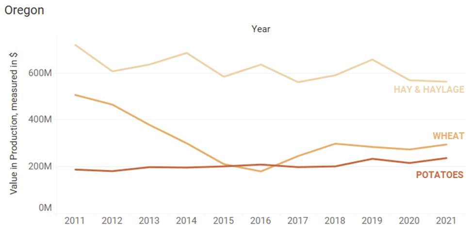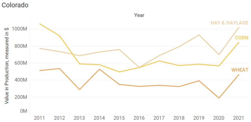 - Crop production valuation can be very similar for a single crop from state to state but can also widely vary from state to state. Corn, for example, has had a mostly increasing trend since the 2014-2015 timeframe in both Kansas and Colorado. Conversely, over the past 10 years the production value of hay and haylage in Oregon has been on a decreasing trend, Arizona has stayed relatively flat, and Colorado has been on an increasing trend. Knowing what’s happening in the areas of interest to you is key.