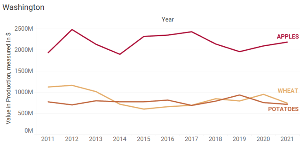 The following pages detail the crop value production trends, along with other key statistics obtained from the USDA State Ag Overview for each state. The trend charts were based on the most recent 2011 to 2021 production data from this USDA NASS QuickStats query: https://quickstats.nass.usda.gov/3DFEE9C2-6BE4-3362-B472-24FAA8890BB4
