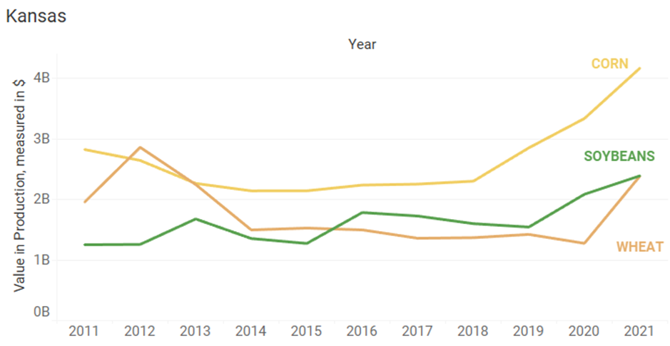 We identified the top 3 crops by crop production valuation[1] and trended them over the last 10 years to give you greater insights into how these crops have fared over time. Staying on top of crop production valuation trends at a state level and beyond can be beneficial for both you and your customers. Looking at trends over time gives you insights into how steady or volatile something is. Knowing this can help you make decisions that are aligned with your risk appetite.