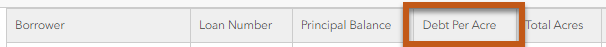Debt per Acre is calculated by dividing the Principal by the Acres.