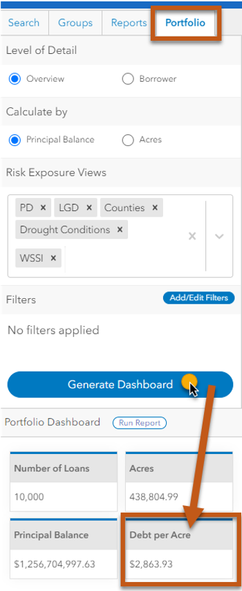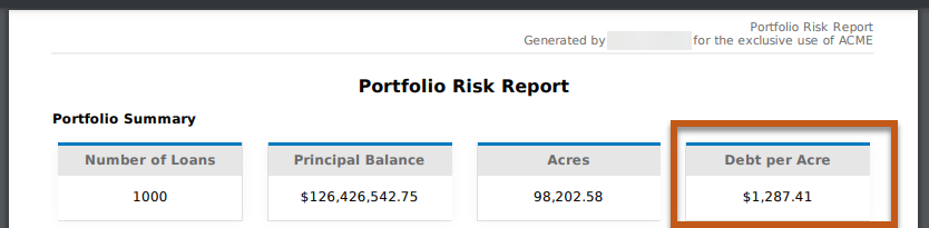 The Portfolio Dashboard and Reports summarize 4 key statistics: Number of Loans, Principal Balance, Acres, and Debt per Acre.