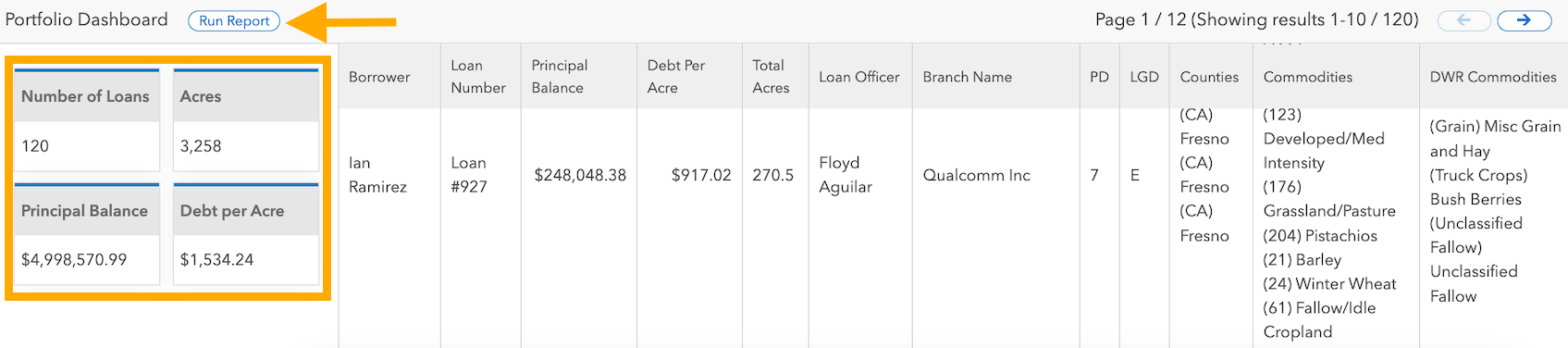 - View the affected loan collateral on the map, a comprehensive summary of the total number of loans, acres, and principal balance affected, and Run a Portfolio Report to export a .csv to begin focusing your efforts on impacted borrowers